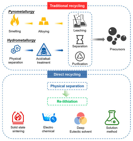 Schematic diagrams of pyrometallurgy, hydrometallurgy, and direct recovery processes [48].