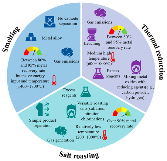 Pyrometallurgy is the process of reducing metal oxides to metals using high temperatures. The fundamental principle involves heating the material to a sufficiently high temperature to induce chemical reactions that separate the target metals [119,120]. The pyrometallurgical recovery process for spent lithium-ion batteries can be divided into thermal reduction, smelting, and salt-assisted roasting methods, as shown in Figure 3.