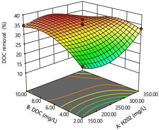 According to the ANOVA results (Table 2), the significant terms included in the model are B (p = 0.0011), AB (p = 0.0301), B2 (p = 0.0022) and A2B (p = 0.0162) while the linear (p = 0.4180) and quadratic (p = 0.9044) terms of factor A (H2O2 concentration) are not individually significant. These nonsignificant terms were retained to maintain model hierarchy, a standard RSM practice when higher-order interactions (e.g., AB and A2B) are significant, as indicated by the footnote in Table 2. This retention reflects a context-dependent effect of H2O2 concentration on DOC removal, modulated by DOC levels.