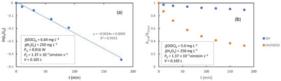 (a) Pseudo-first-order kinetics of DOC removal during UV/H2O2 treatment; (b) Decrease in absorbance at 254 nm during photolysis and UV/H2O2 treatment.