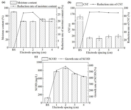 (a) Moisture content and its reduction rate, (b) CST and its reduction rate, and (c) SCOD concentration in the supernatant and its growth rate after the treatment under different electrode spacings.