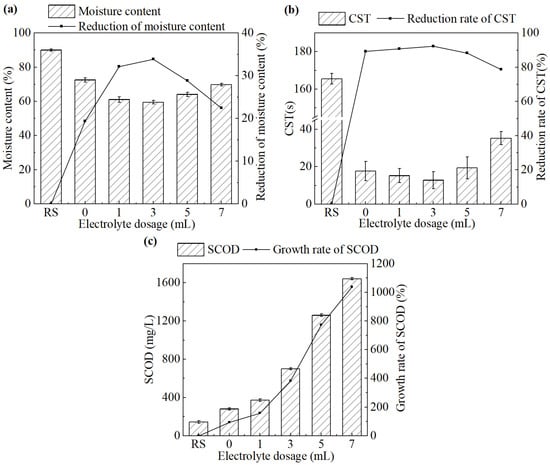 (a) Moisture content and its reduction rate, (b) CST and its reduction rate, and (c) SCOD concentration in the supernatant and its growth rate after the treatment under different electrolyte dosages.