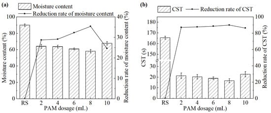 (a) Moisture content and its reduction rate, (b) CST and its reduction rate after the treatment under different PAM dosages.