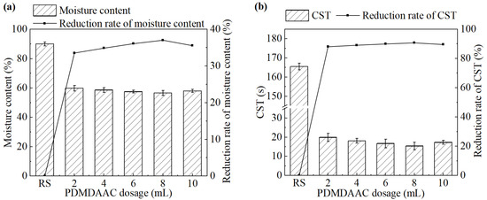 (a) Moisture content and its reduction rate, (b) CST and its reduction rate after the treatment under different PDMDAAC dosages.