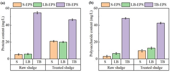 As shown in Figure 8a, the protein content in tightly bound EPS (TB-EPS) was significantly higher than that in soluble EPS (S-EPS) and loosely bound EPS (LB-EPS) of the sludge. Following electrochemical conditioning, the protein content in TB-EPS decreased, whereas the protein content in both S-EPS and LB-EPS increased. A similar trend was observed for polysaccharides, as illustrated in Figure 8b. After the treatment, the polysaccharide contents in S-EPS and LB-EPS also increased, though to a lesser extent compared to proteins.