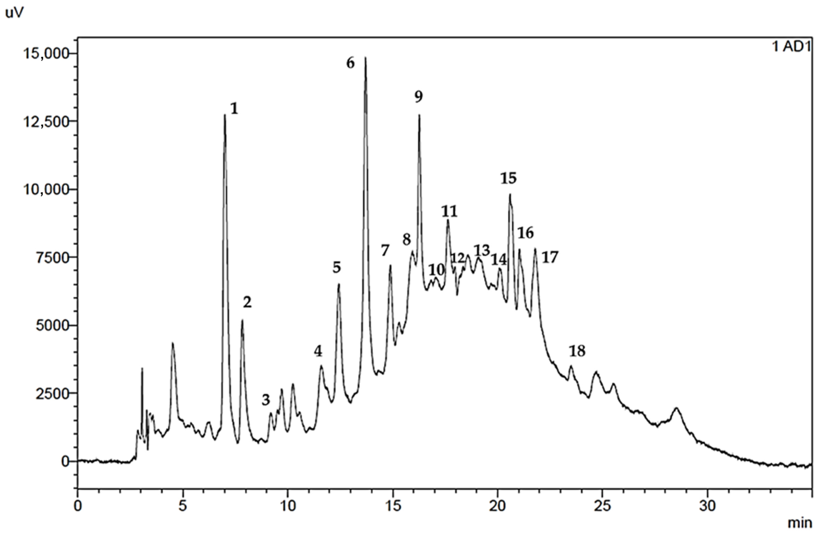 2.7. Qualitative High Performance Liquid Chromatography (HPLC) Analysis of the Extracts