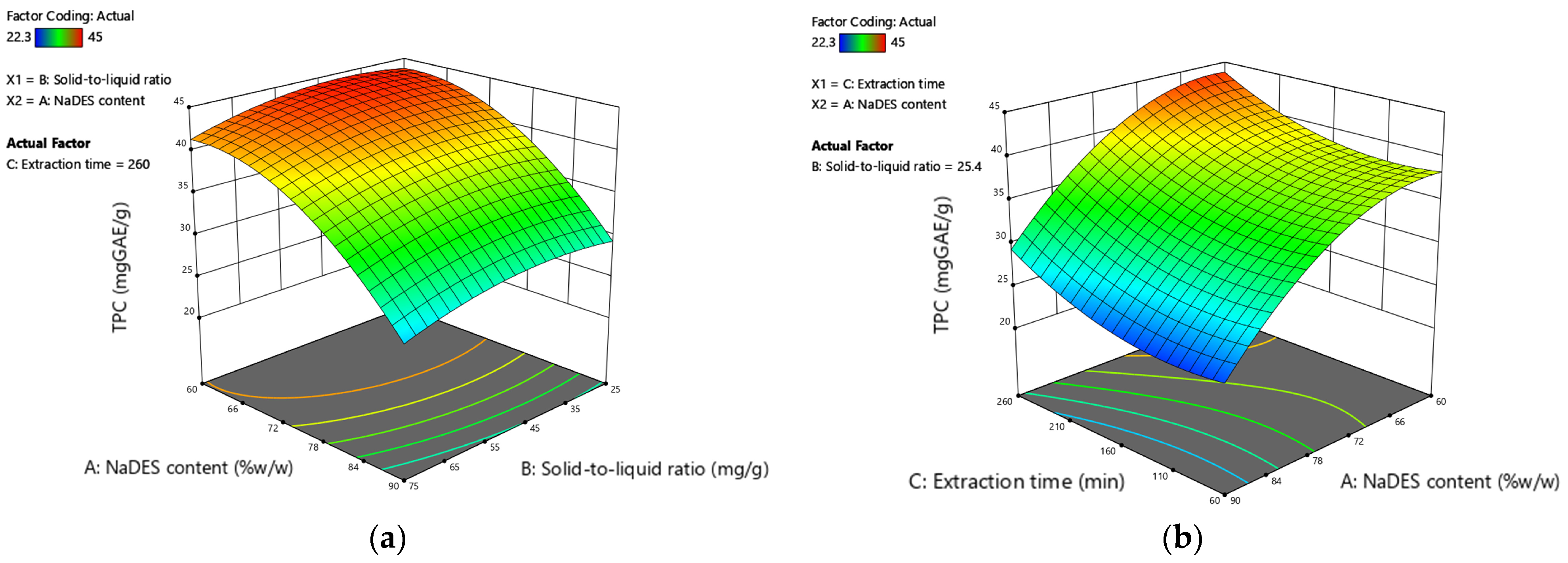 A: NaDES Content (%w/w) | B: Solid/ Liquid Ratio (mg/g) | C: Extraction Time (min) | R1: TPC (mg GAE/g) | R2: TFC (mg CE/g) | |