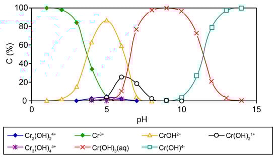 Current conventional chromium removal methodologies encompass chemical precipitation, electrochemical processes, membrane separation, solvent extraction, and adsorption techniques []. For instance, Jiao et al. [] employed an acid leaching–alkali precipitation–evaporation approach to recover chromium from waste magnesia-chrome refractories. Although this method facilitates resource recovery, its multi-step nature, high energy consumption, and lack of validation for treating low-concentration chromium-containing wastewater limit its direct applicability in wastewater treatment. Yao et al. [] achieved simultaneous removal of Cr(VI) and Cr(III) via electrolysis using a titanium (Ti) anode. Mechanistic analysis indicated that corrosion of the Ti anode produces Ti3+ and Ti2+ species, which provide electrons for the reduction in Cr(VI) to Cr(III), while continuous generation of hydroxide ions (OH−) at the cathode promotes precipitation. Maximum removal efficiencies of 80.5% for Cr(VI) and 79.4% for total chromium were achieved within 12 h. Silva et al. [] reported 96.5% chromium removal during electroplating of raw tannery wastewater, noting that the addition of a defoamer effectively suppressed foam formation without reducing removal efficiency. Riaz et al. [] developed and characterized polyurethane–cellulose acetate blend membranes and evaluated their permeability and Cr(VI) rejection performance under varying pH, pressure, and salt concentration conditions. Optimal Cr(VI) removal was observed at pH 3 under an operating pressure of 0.4 MPa. Wang et al. [] achieved efficient separation of chromium and vanadium through solvent extraction using EHEHPA–sulfate ion complexation. While this study highlights the potential of complexation for improving selectivity, its primary focus is metal separation rather than deep purification, and the solvent extraction process may involve risks of organic phase loss and secondary pollution. Similarly, Rim et al. [] demonstrated the extraction of Cr(III) from aqueous solutions using polyoxyethylene alcohols in the presence of sodium dodecylbenzenesulfonate. Although this method provides an alternative strategy for complexation, it introduces surfactants, which increases both the complexity and cost of the system, and may potentially lead to new environmental issues.