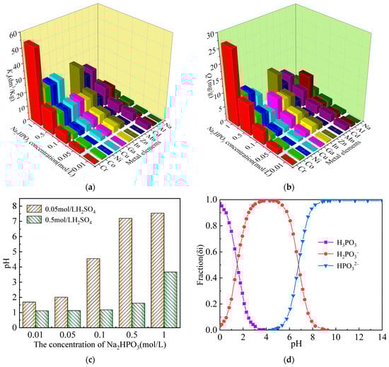 Cr-laden industrial effluents typically contain coexisting metal ion. To systematically evaluate the influence of sodium phosphite (Na2HPO3) concentration on the selectivity of IRA-900 resin, simulated mixed solutions incorporating graded Na2HPO3 concentrations (0.01, 0.05, 0.1, 0.5, and 1 mol·L−1) were formulated. The experimental parameters were maintained as follows: time = 2 h, temperature = 298 K, Liquid-solid ratio (V/m) = 10 mL/0.1 g, and H2SO4 concentration = 0.5 mol·L−1. The concentrations of the simulated mixed solution are detailed in Table 1. The composition of the simulated mixed solution (Table 1) was designed according to the typical characteristics of chromium-containing industrial wastewater (especially tannery wastewater [,,]). The high concentration of sodium (Na, 1000 mg·L−1) simulates the common saline background in such effluents. The concentrations of chromium (Cr) and other heavy metal ions (e.g., Al, Zn, Cu, Ni, at 500–1500 mg·L−1) were chosen with reference to values reported in previous studies on tannery and electroplating wastewater, aiming to mimic a realistic scenario with high pollution load and the presence of multiple competing ions. The selected ions cover various valences (e.g., Al3+, Cr3+, Cu2+, Na+) and chemical behaviors to rigorously evaluate the selectivity of the IRA-900 resin in a complex system. The concentrations of all coexisting metal ions are representative of industrial scenarios.