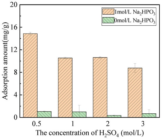 The influence of solution acidity on adsorption performance was systematically evaluated by measuring Cr3+ adsorption capacities at sulfuric acid concentrations of 0.5, 1, 2, and 3 mol·L−1 (Figure 3). In the absence of sodium phosphite, the resin showed negligible adsorption of Cr3+. When 1 mol·L−1 sodium phosphite was introduced, the maximum Cr3+ adsorption capacity (14.9 mg·g−1) was achieved at 0.5 mol·L−1 H2SO4, with a progressive decrease observed as acid concentration increased. This trend can be explained by the speciation behavior of phosphite: under highly acidic conditions (pH < 1.3), H3PO3 becomes the dominant species. Since H3PO3 has a weaker complexation ability with Cr3+ compared to H2PO3−, the adsorption efficiency is reduced [].