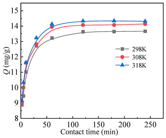 The adsorption kinetics and the effect of temperature on Cr3+ uptake are shown in Figure 4. The resin exhibited rapid adsorption, reaching 90% of its maximum capacity within 30 min. Subsequently, the adsorption rate gradually decreased, approaching equilibrium at 180 min with a capacity of 14.5 mg·g−1 at 318 K. Increasing the temperature from 298 K to 318 K not only raised the equilibrium adsorption capacity from 13.5 mg·g−1 to 14.5 mg·g−1 but also significantly accelerated the adsorption kinetics.