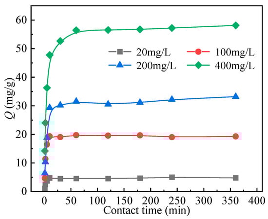 The equilibrium adsorption capacity as a function of the initial Cr3+ concentration is shown in Figure 5. The adsorption capacity increased progressively from 5.02 mg·g−1 to 60.13 mg·g−1 as the initial concentration rose from 20 mg·L−1 to 400 mg·L−1, with specific values of 19.28 mg·g−1 at 100 mg·L−1 and 33.20 mg·g−1 at 200 mg·L−1. This trend is attributed to the stronger concentration gradient at higher Cr3+ levels, which enhances the mass transfer driving force and promotes adsorption []. Correspondingly, the adsorption kinetics accelerated with increasing initial concentration, although the time required to reach equilibrium extended from 10 min (at 20 mg·L−1) to 60 min (at 400 mg·L−1), with intermediate equilibration times of 20 min and 30 min observed at 100 mg·L−1 and 200 mg·L−1, respectively. This pattern reflects the combined effects of concentration-driven adsorption enhancement and intraparticle diffusion limitations.