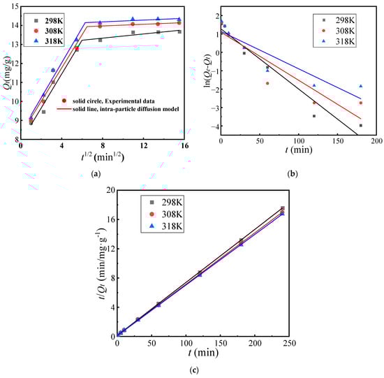 The adsorption kinetics of Cr(III) were evaluated at three different temperatures (298, 308, and 318 K). The experimental data were fitted with three kinetic models: intraparticle diffusion, pseudo-first-order, and pseudo-second-order, as shown in Figure 6a–c and summarized in Table 2. Figure 6a presents two distinct linear regions in the intraparticle diffusion model, indicating multiple adsorption stages involving film diffusion, pore diffusion, and equilibrium. The slope kp reflects the intraparticle diffusion rate, with higher values corresponding to faster adsorption. In the first stage, the kp values at 298 K, 308 K, and 318 K were 0.8940, 0.8759, and 0.9195, respectively, suggesting that pore diffusion controls the initial adsorption and that the IRA-900 resin exhibits a high adsorption rate for Cr(III). The porous structure of the resin provides abundant active sites on its internal channels, facilitating rapid uptake []. In the second stage, adsorption gradually approaches equilibrium. Notably, the fitted lines at all temperatures do not pass through the origin, implying that the overall process involves both chemical adsorption (ion exchange) and intraparticle diffusion. According to Table 2, the pseudo-second-order model yields a correlation coefficient (R2)of 0.9999, indicating an excellent fit. This supports that the adsorption follows pseudo-second-order kinetics, with chemical adsorption as the rate-limiting step. Therefore, in the Na2HPO3–H2SO4 system, ion exchange is the predominant adsorption mechanism.