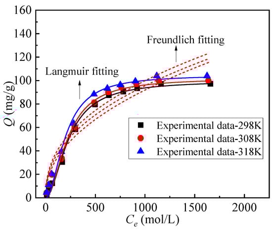 By altering the initial concentration of Cr3+ in the solution and the adsorption temperature, adsorption isotherms at different temperatures were obtained. In the sulfuric acid solution, with initial Cr3+ concentrations ranging from 0 to 1700 mg·L−1, isothermal adsorption experiments were conducted at 298, 308, and 318 K. The experimental data were fitted using the Langmuir (4) and Freundlich (5) isothermal models, respectively.