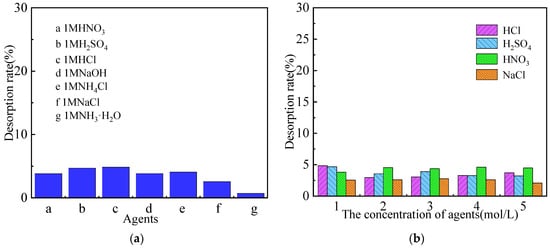 (a) Effect of different desorbent on the desorption rate of Cr3+; (b) Effect of desorbent concentration on the desorption rate of Cr3+ (The resin used for desorption was saturated under the following adsorption conditions: 1000 ppm Cr(III), V/m: 40 mL/0.05 g, 1 mol/L Na2HPO3, duration of 24 h, temperature of 298 K, and 0.5 mol/L H2SO4).