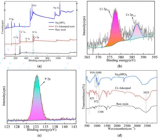 (a) Full XPS spectrum of the resin and Na2HPO3; (b) narrow XPS spectrum of Cr2p; (c) narrow XPS spectrum of P2p; (d) FT-IR spectra of resin and Na2HPO3.
