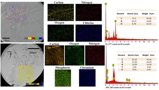 The SEM-EDS spectra of the resin before and after adsorption are shown in Figure 10. The primary elements of the pristine resin were C, N, and Cl. After adsorption, additional elements (P, O, and Cr) were detected in the resin, confirming the successful adsorption of Cr3+.