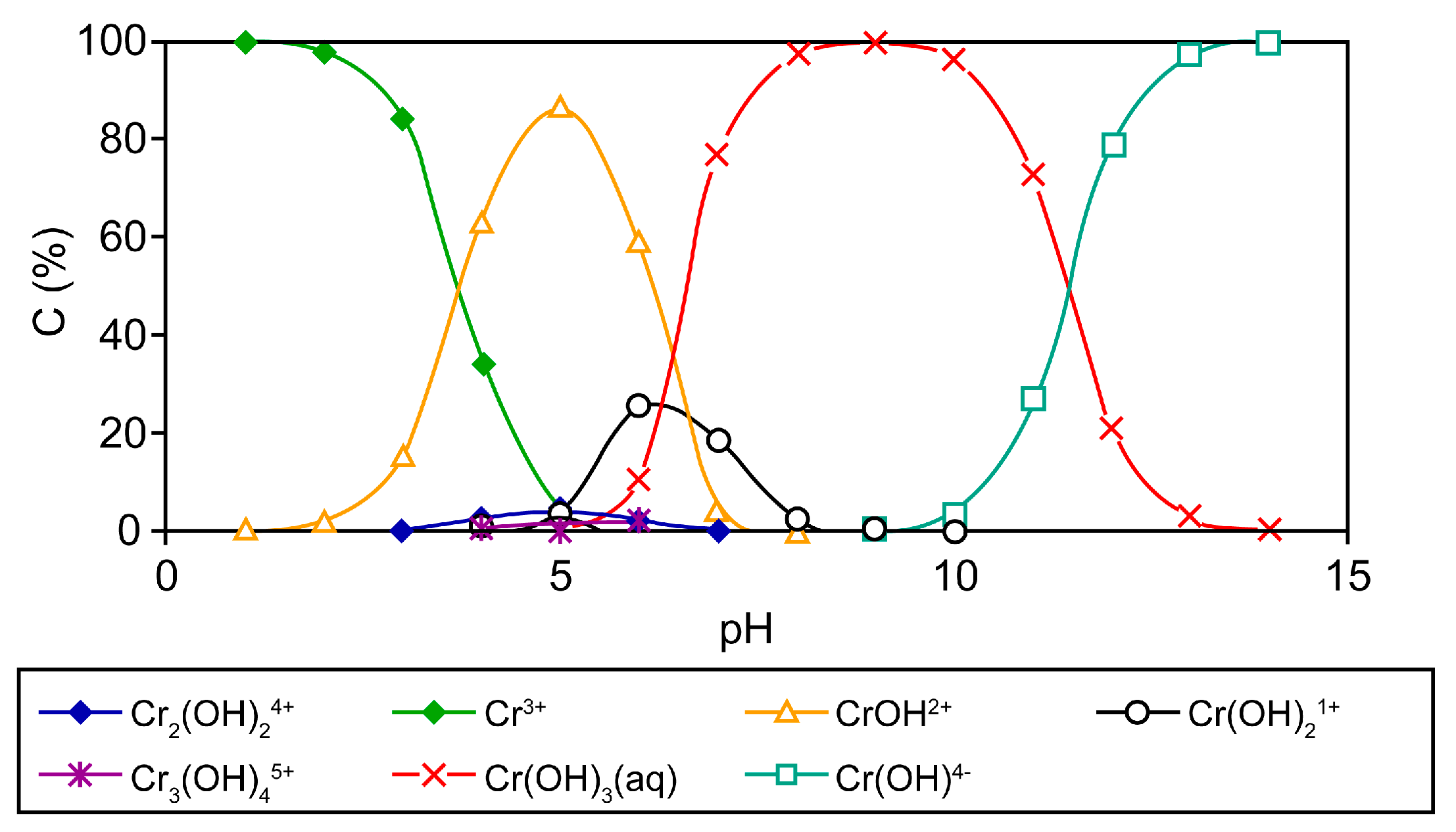 - Ma, H.; Hua, L.; Lian, K.; Ma, X. Adsorptive removal of trivalent chromium in aqueous solution using precipitate produced from aluminum tanning wastewater. Water Air Soil Poll. 2014, 225, 1956. [Google Scholar] [CrossRef]