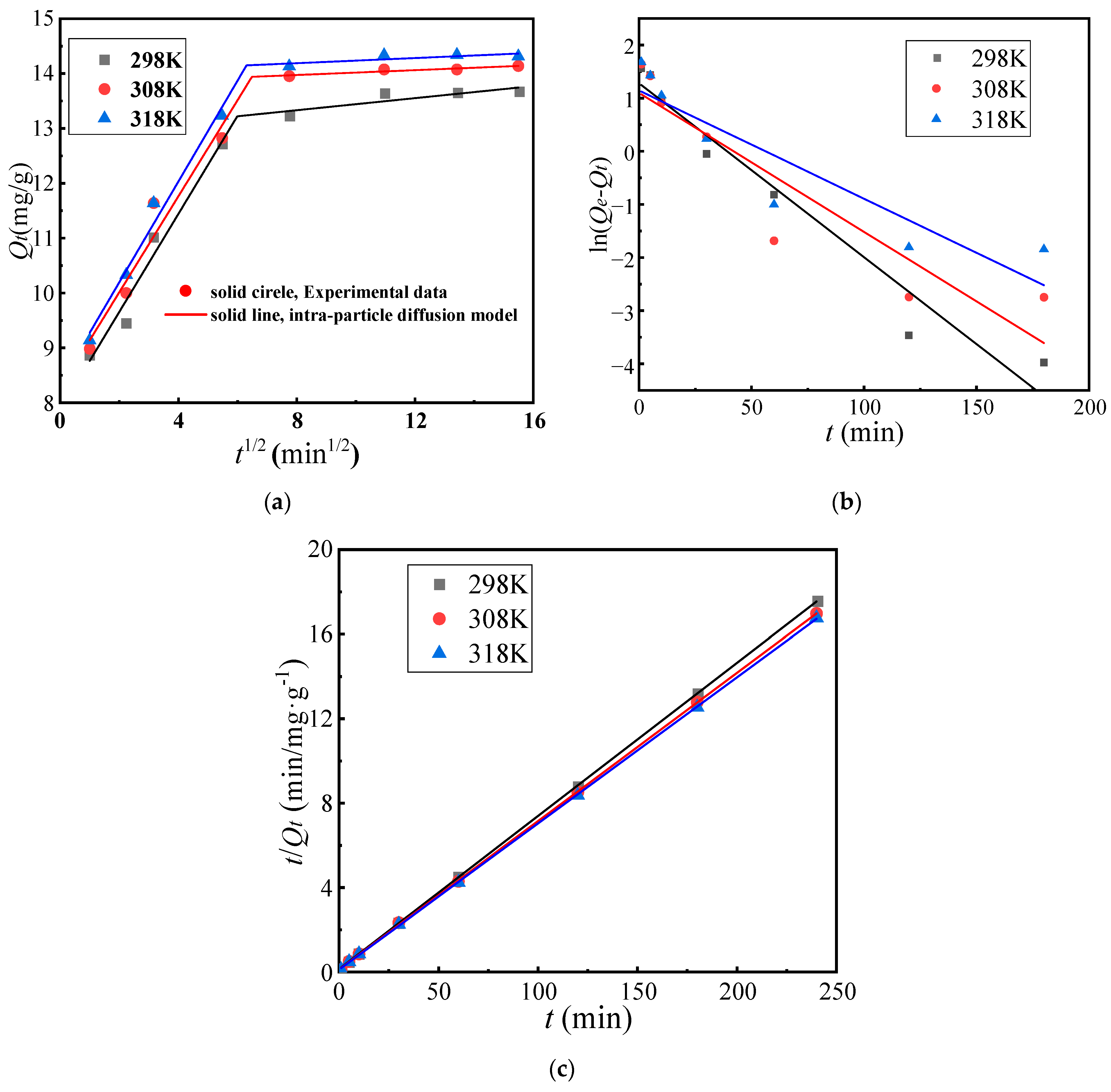 k1 (min−1) | Qe (mg/g) | R2 | k2 (g/mg/min) | Qe (mg/g) | R2 | kp | R2 | ||
