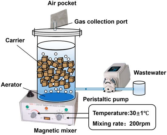 A lab-scale sequencing batch biofilm reactor (SBBR) with an effective working volume of 5 L was employed (Figure 1). The reactor operated on two 12 h cycles per day, each consisting of 2 min influent feeding, 700 min reaction, 15 min settling, and 3 min effluent discharge, with an exchange ratio of 50%. During the reaction phase, a bottom-mounted aeration disk supplied stable low-oxygen aeration, regulated by an air compressor and a mass flow controller to precisely maintain dissolved oxygen (DO) levels. To support the co-culture of anammox bacteria and denitrifiers, the DO concentration was controlled at 0.8–1.0 mg/L [12]. The reactor was maintained at 30 ± 1 °C and agitated at 200 rpm using a thermostatic magnetic stirrer. A gas collection port located at the top of the sealed reactor was used to capture N2O emissions.