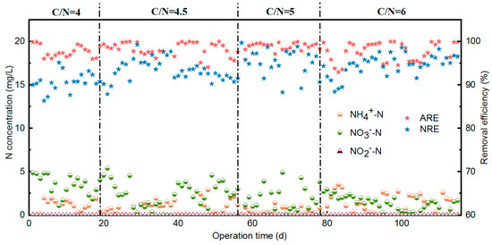 Table 2 presents the effluent nitrogen concentrations, nitrogen removal efficiency (NRE), and nitrous oxide (N2O) emissions of the system. When the C/N ratio increased from 4.0 to 5.0, effluent NH4+-N remained at a relatively low level. A consistently high ammonium removal efficiency (ARE) could be sustained across different C/N ratios, provided that aeration was sufficient. In general, however, effluent nitrate concentrations declined progressively as the C/N ratio increased. A relatively high influent COD enhanced denitrification without exerting inhibitory effects on autotrophic bacteria in the anammox reactor. This effect can be attributed to the gradual thickening of heterotrophic bacterial biofilms on the carrier surface, which expanded the anaerobic microzones within the biofilm and thereby promoted synergistic interactions between anammox and denitrification [18]. Consequently, this led to an improvement of ~5% in NRE. At the highest C/N ratio tested (6.0), heterotrophic bacteria became predominant over autotrophic bacteria, leading to reductions in both ARE and NRE. These results highlight that optimizing the C/N ratio is critical to balancing the activities of nitrifiers, anammox bacteria, and denitrifiers, thereby achieving efficient nitrogen removal within a single reactor [19].