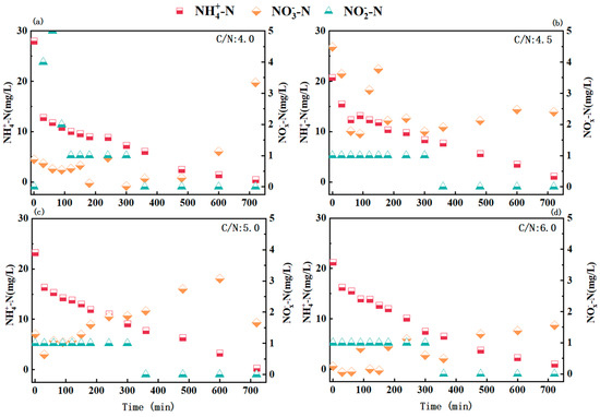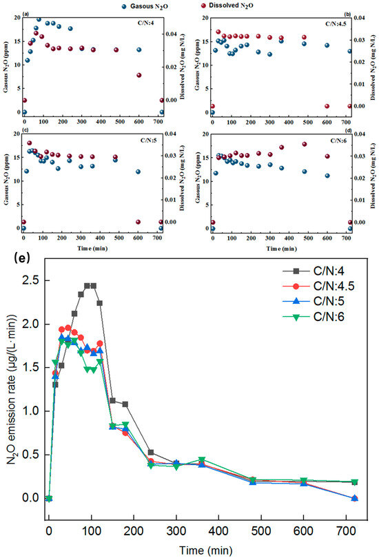 Figure 4e illustrates N2O emission rates under different C/N conditions. At the lowest C/N ratio of 4.0, the emission rate was the highest (2.44 µg/(L·min)) primarily due to incomplete denitrification. In contrast, higher C/N ratios of 4.5, 5.0, and 6.0 resulted in lower peak emission rates (1.96, 1.85, and 1.82 µg/(L·min), respectively), suggesting reduced N2O generation through NH2OH oxidation and heterotrophic denitrification pathways [22,23] as the C/N ratio increased.