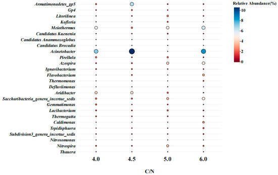 Changes in the relative abundance of bacterial genera at different C/N (30 °C; pH 7.0; DO 0.8 mg/L) ratios.
