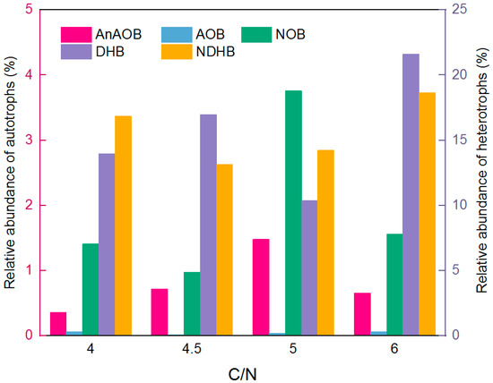 Figure 6 illustrates the relative abundances of key functional bacterial groups under varying C/N ratios. Notably, the abundance of heterotrophic bacteria exceeded that of autotrophic bacteria in the presence of organic matter. The relative abundance of anaerobic ammonium-oxidizing bacteria (AnAOB) initially increased with rising C/N ratios, reaching a maximum of 1.5% at a C/N ratio of 5.0, and subsequently declined at higher ratios. Among nitrifiers, AOB were scarcely detected, whereas NOB, including comammox bacteria, were prevalent within the biofilms. NOB and comammox bacteria exhibited a trend similar to AnAOB, with their relative abundance peaking at a C/N ratio of 5.0. Previous studies have indicated that comammox bacteria, rather than conventional AOB or NOB, contribute minimally to N2O emissions due to their complete ammonia-oxidation gene pathway [32,33]. In contrast, the relative abundances of denitrifying heterotrophic bacteria (DHB) and non-denitrifying heterotrophic bacteria (NDHB) did not display clear correlations with the C/N ratio, although they consistently dominated the microbial community structure. At a C/N ratio of 5.0, the moderately lower abundance of heterotrophic bacteria facilitated the stable immobilization and establishment of AnAOB within the biofilm microbial community. Under this condition, the combination of relatively low denitrifiers with sufficient AnAOB and comammox bacteria likely minimized N2O emissions while maintaining efficient nitrogen removal.