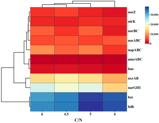 Figure 7 presents a heatmap illustrating the variations in functional gene abundance under different C/N ratios. The abundance of anammox-associated functional genes (hzs and hdh) [34] was consistently much higher than that of other nitrogen conversion genes. At a C/N ratio of 5.0, the relative abundance of hzs and hdh reached its maximum, coinciding with the highest nitrogen removal efficiency. As the C/N ratio increased, the total abundance of denitrification genes (nar, nap, nir, nor, and nos) gradually increased. This pattern supports the conclusion that anammox was the dominant pathway, coupled with denitrification in the oxygen-limited SBBR. Within the nitrification process, the nitrite oxidoreductase (nxr) accounted for more than 70% of the total nitrification enzymes, suggesting the potential occurrence of comammox in the system. Biofilm reactors are known to effectively cultivate and enrich comammox, enabling them to play a leading role in nitrification [35,36]. Because of their complete nitrifying enzyme systems, comammox bacteria can significantly reduce N2O emissions compared to canonical ammonia oxidizers [37,38]. Moreover, the abundance of the key enzyme Nos, which catalyzed the reduction of N2O to N2 [39], increased with higher C/N ratios, indicating that its activity was influenced by C/N conditions. At the optimal C/N ratio of 5.0, the nos enzyme was at its peak, suggesting that more N2O was completely converted into N2. Consequently, N2O emissions were effectively reduced under these conditions. In summary, an optimal C/N ratio promotes a synergistic interaction among anammox, comammox, and denitrification functional genes, thereby enhancing nitrogen removal efficiency while minimizing greenhouse gas emissions.