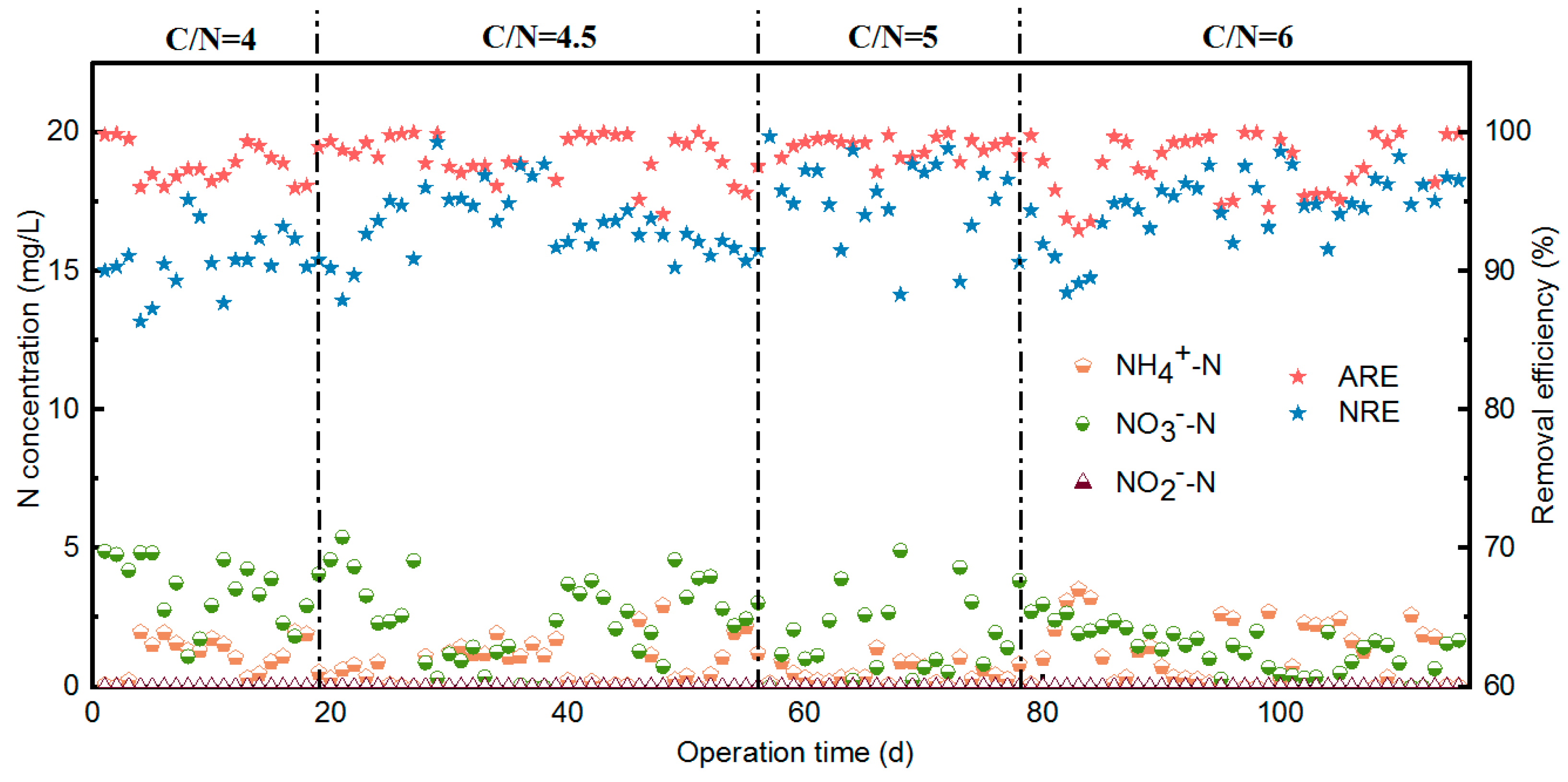 C/N | NH4+-N mg/L | NO2−-N mg/L | NO3−-N mg/L | ARE % | NRE % | N2O mg |