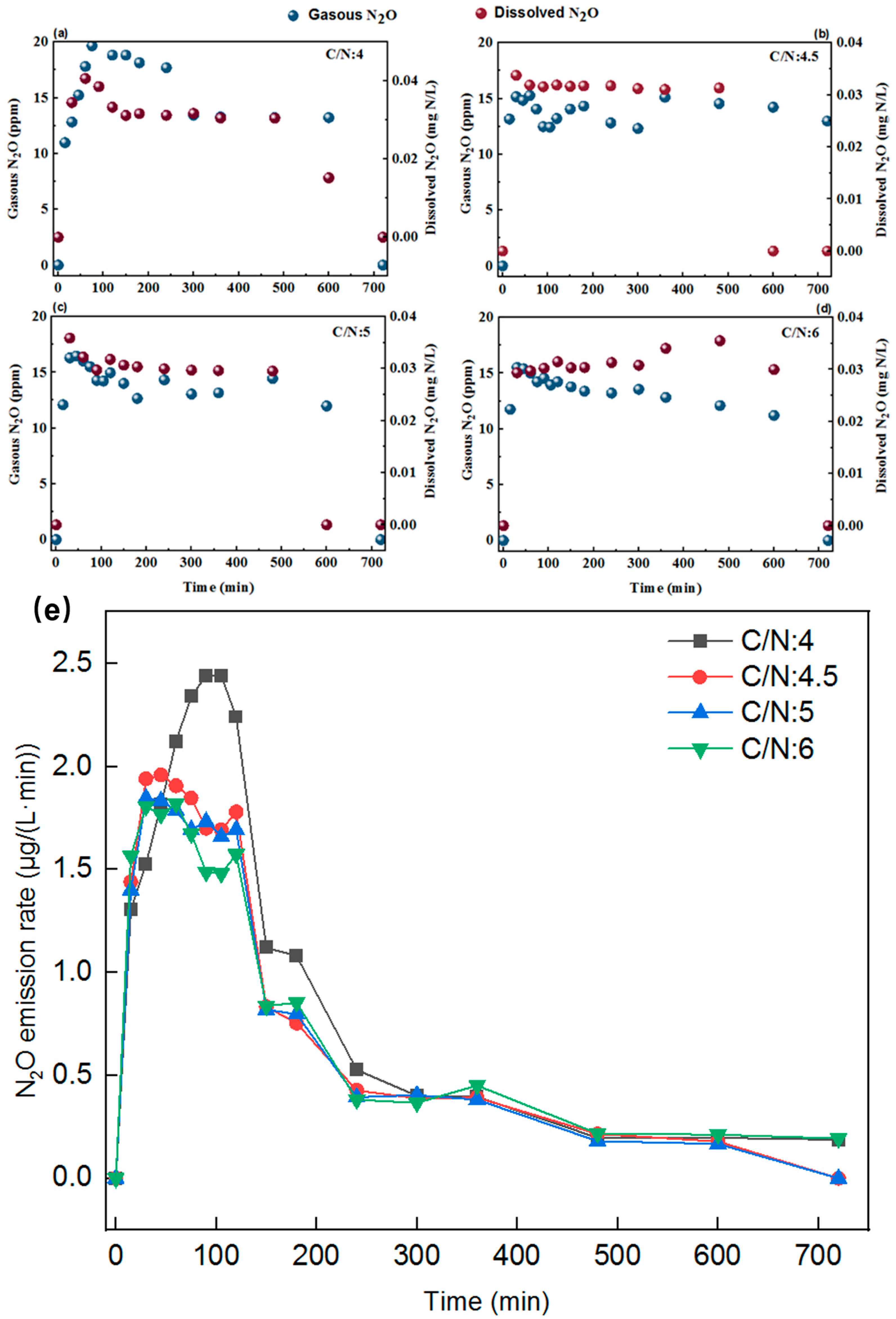 - CN2O,gas, CN2O,dis, denote N2O concentrations in the off-gas and solution (mg/L), while CN2O,gas,n, and CN2O,dis,n indicate concentrations at the sampling intervals.