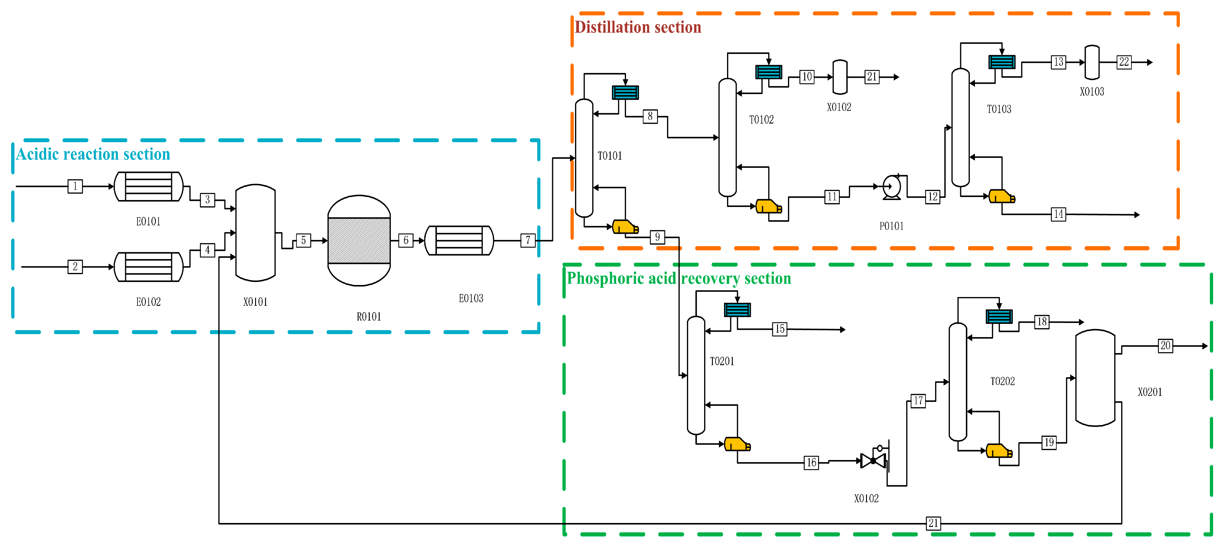 3 and other impurities enter T0102 for secondary distillation, and the kettle distillate is pressurised through P0101 and enters T0103 for final purification distillation. A high-purity PH