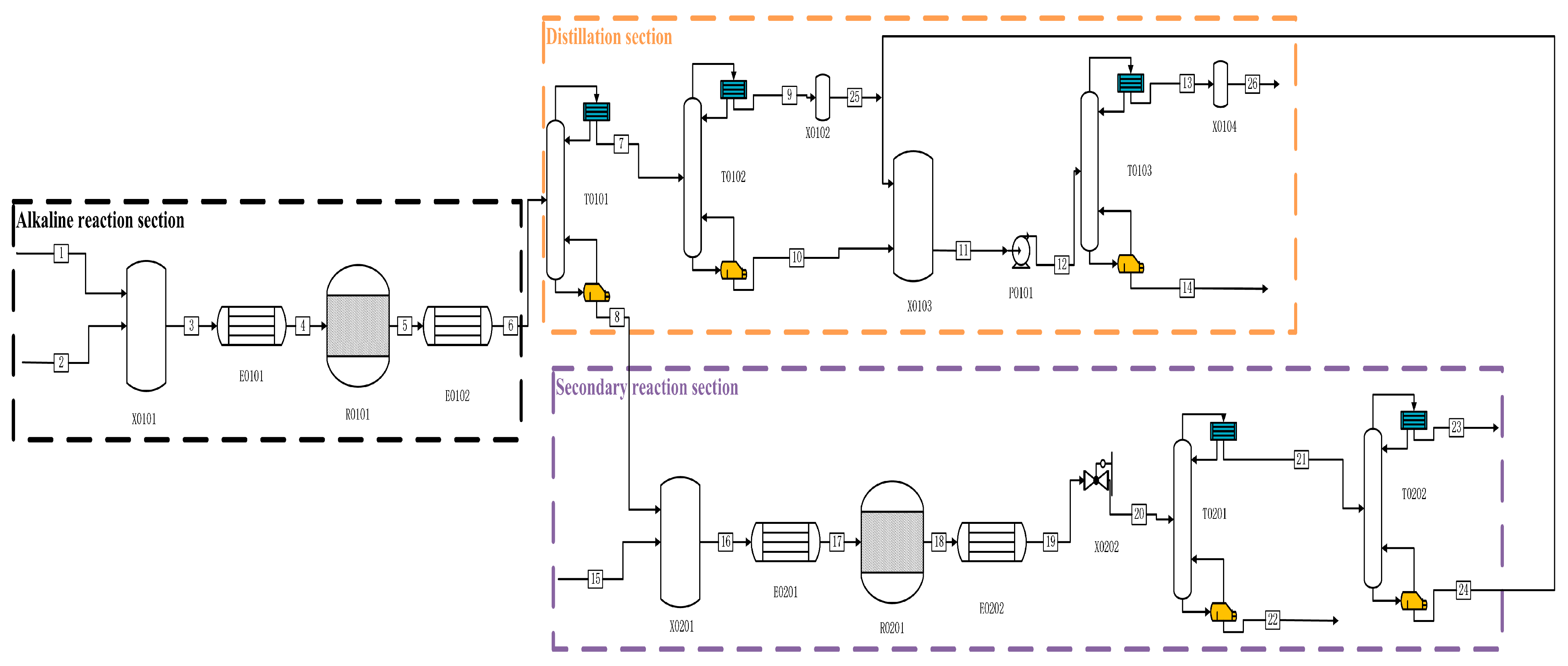 4 distilled from the tower kettle is partially refluxed to the initial mixer X0101 for circulation, and most of the H