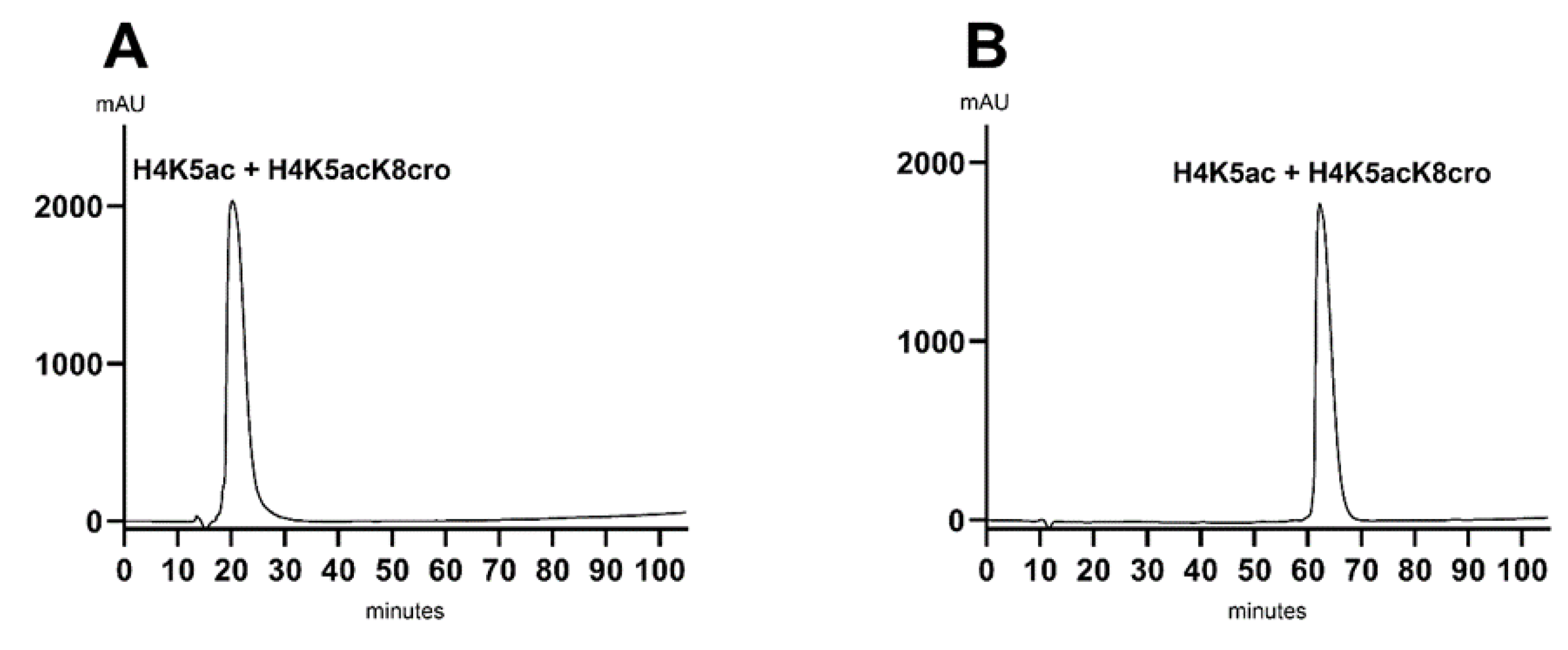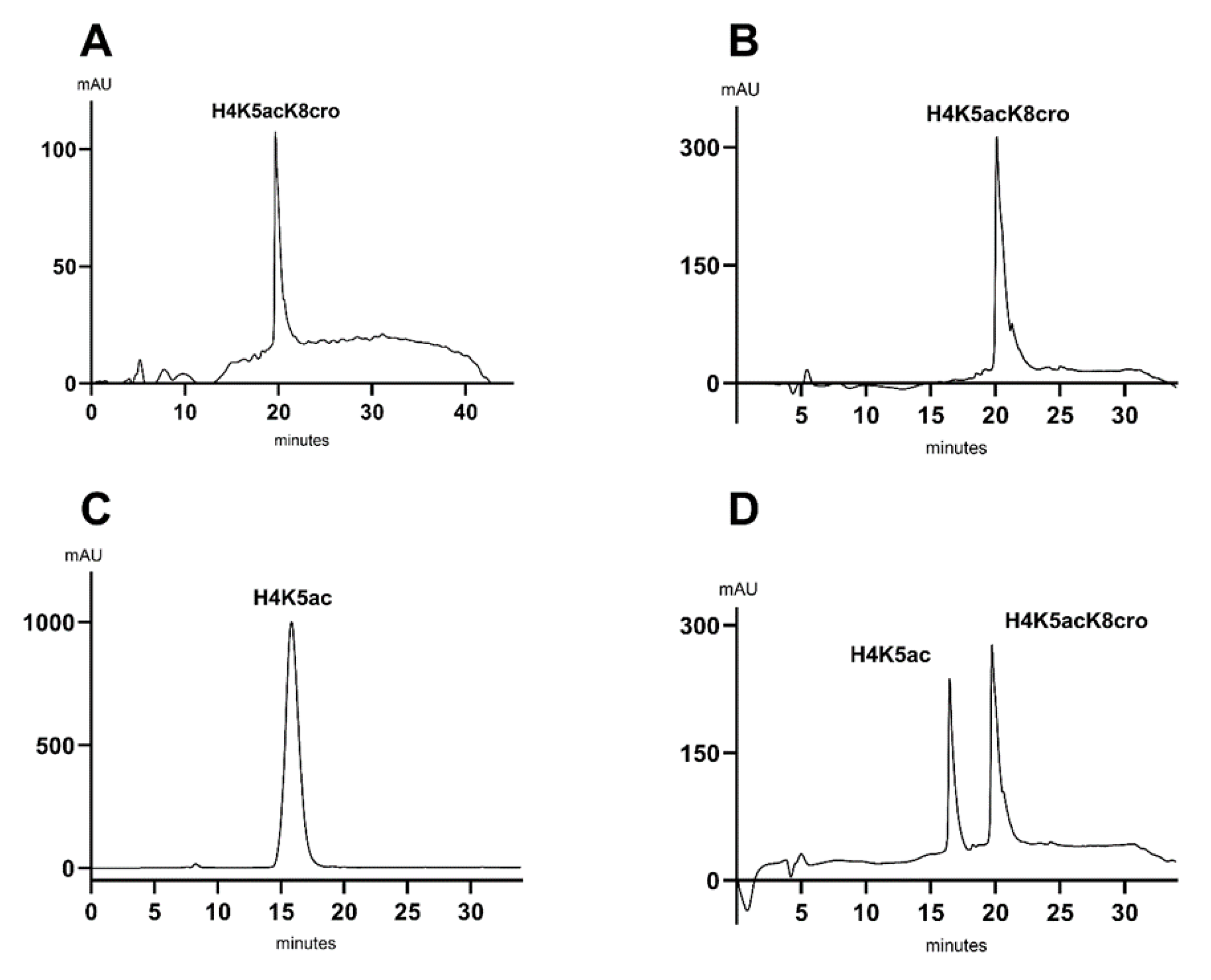 Figure 2A), which was more hydrophobic and should elute later than peptide H4K5ac. That result indicated that peptide H4Kac5K8cro already eluted by minute 20. This led us to shorten the method by finishing it at 52% acetonitrile instead of 80%. To validate the percentage of elution, both peptides were run individually with the new 5 to 52% in 19 min. Peptide H4K5acK8cro eluted at minute 20 (