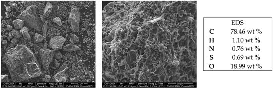 Figure 1 presents the SEM micrographs of the CH sample, revealing its highly heterogeneous and rough surface morphology with non-uniform pore distribution, attributed to the chemical–thermal activation process. This irregular and porous structure suggests a high density of active sites, which correlates with enhanced adsorption capacity. The EDS results confirm high carbon and oxygen content, indicative of successful activation. The detected sulfur (0.69 wt %) is attributed to the intrinsic elemental composition of the cocoa bean husks, which naturally contain minor amounts of sulfur-bearing organic compounds, such as sulfur-containing amino acids and other biomolecules. Comparable results have been documented in previous studies, where elemental analyses of cocoa husks revealed the presence of sulfur as part of their natural mineral profile []. These sulfur functionalities may function as polar sites, potentially enhancing the adsorption of dye molecules through electrostatic attraction or specific interactions.