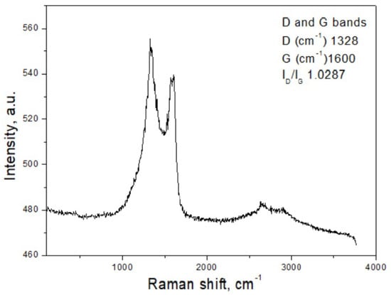 Raman spectroscopy (Figure 2) was employed to characterize the carbon structure of the synthesized CH material. The spectrum displays two prominent features at around 1328 cm−1 and 1600 cm−1, attributed to the D band, associated with structural defects, and the G band, characteristic of ordered graphitic domains, respectively []. The simultaneous presence of these bands indicates that the carbon framework contains both well-organized and defect-rich graphitic regions. The intensity ratio ID/IG, used here as an indicator of oxidation-related disorder in the carbon lattice [], was determined to be approximately 1.03. This value suggests a relatively high defect density, consistent with partial oxidation and a predominantly amorphous characteristic of the material. In addition to the G and D bands, a weaker peak was observed at approximately 2500 cm−1. This feature is likely related to an overtone or combination mode commonly reported in carbon-based materials, sometimes referred to as the 2D region. Its presence may indicate structural ordering effects in certain graphitic domains, as noted in previous studies [].