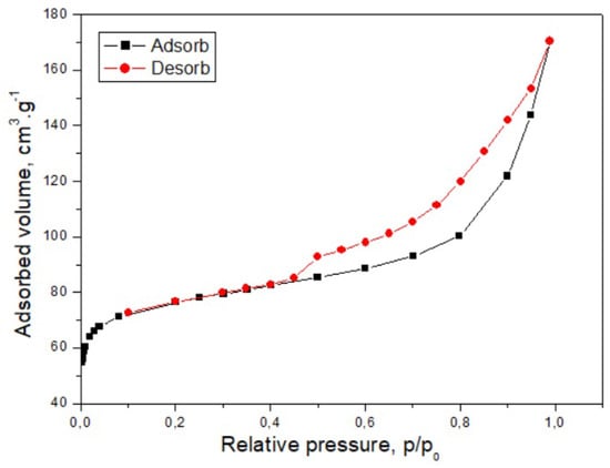 Textural parameters, including pore size distribution and total pore volume, were assessed by low-temperature nitrogen adsorption–desorption measurements conducted on a Quantachrome AUTOSORB iQ-C-MP-AG-AG NOVA 1200e analyzer (Quantachrome Instruments, Boynton Beach, FL, USA). Specific surface area values were obtained using the Brunauer–Emmett–Teller (BET) method.