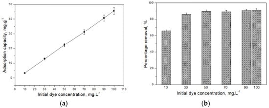 To evaluate the adsorption isotherm, a series of batch experiments was conducted using CH at varying initial pollutant concentrations between 10 and 100 mg·L−1. The resulting data, presented in Figure 4, illustrate (a) the adsorption capacity of the material and (b) the corresponding removal efficiency across the tested concentration range.