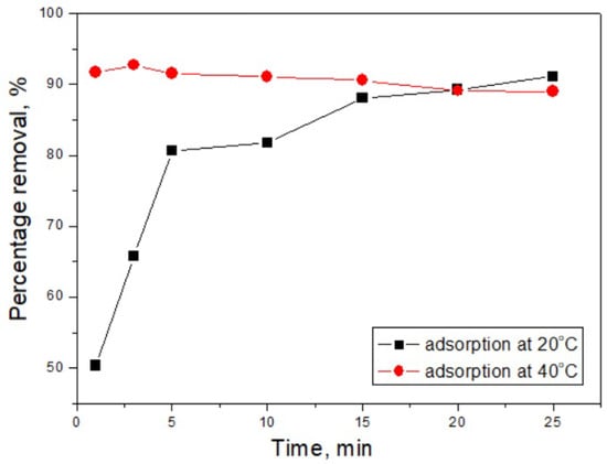 To evaluate the adsorption process from its onset until equilibrium was reached, experiments were conducted at different temperatures (20 °C and 40 °C) and contact times ranging from 1 to 25 min, using an initial dye concentration of 100 mg·L−1 (Figure 6).