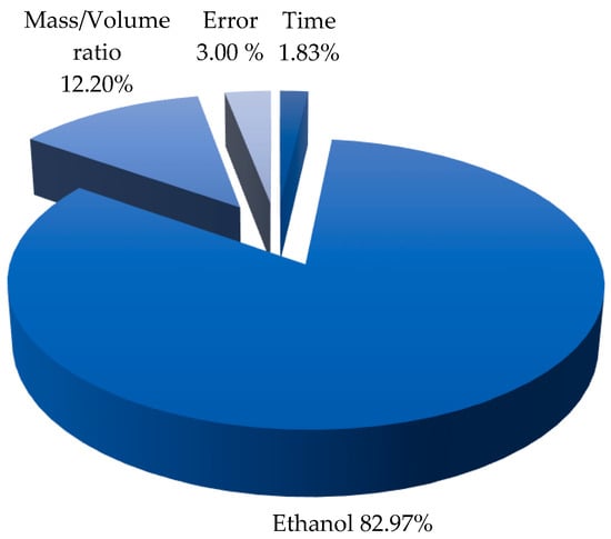 Figure 2 shows the relative influence of individual factors on the extraction of polyphenols from pomegranate peel. Ethanol is observed to be the most decisive factor, contributing 82.97%, followed by the mass-to-volume ratio at 12.20%. Extraction time has a minor impact, accounting for only 1.83%, while the margin of error is 3% (Table 3). These results indicate that solvent selection is the key factor for optimizing the extraction of the target compounds, as it influences the solubility and release of polyphenols from the plant matrix []. Its high influence (82.97%) suggests that the efficiency of the process largely depends on the concentration and solvent properties of ethanol. The mass-to-volume ratio (12.20%) also plays an important role, as a greater amount of material in a fixed volume may affect the availability of compounds for dissolution []. Extraction time (1.83%) has a negligible effect, suggesting that prolonging the process does not significantly improve compound recovery. The margin of error (3%) reflects experimental variations.