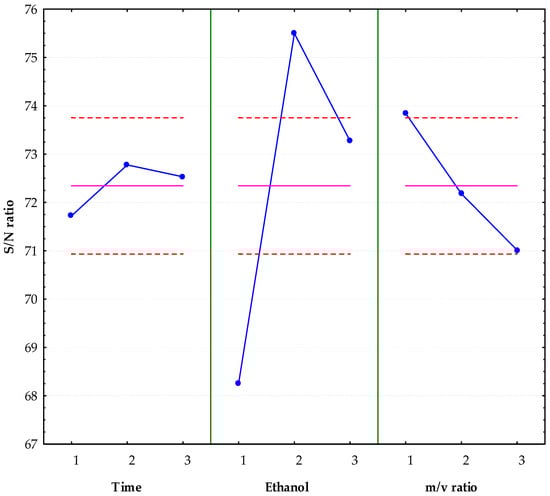 Figure 3 shows a main effects analysis of the signal-to-noise ratio (S/N), used to evaluate the extraction efficiency of polyphenols. It was observed that extraction time at level 2 (20 min), ethanol concentration at level 2 (40%), and the mass-to-volume ratio at level 1 (1:12) were the combinations that offered the best response in terms of S/N. Under these conditions, the software predicted an S/N value of 77.43 (Table 4). After performing the extraction under the optimal conditions and experimentally validating the process, an S/N value of 88.43 ± 0.66 (8801.89 ± 621.41 mEq of GA/L) was obtained, exceeding the value predicted by the model.