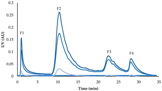 The chromatogram obtained during the fractionation stage using flash chromatography shows the separation of four fractions composed of molecules present in the pomegranate peel extract. Most peaks likely correspond to ellagitannins and other polyphenols, as these are characteristic compounds of this plant matrix (Figure 4) []. There are some reports in the literature where flash chromatography has been used for the separation of polyphenolic compounds from pomegranate peel with EcoFlex C18 and RediSep C-18 columns; however, the use of Amberlite XAD-16 in flash chromatography for the separation of these compounds has not been previously reported in the literature [,]. This resin, employed in adsorption chromatography, favors the retention of polar and hydrophobic compounds such as ellagitannins and other polyphenols, facilitating their separation during the process [].