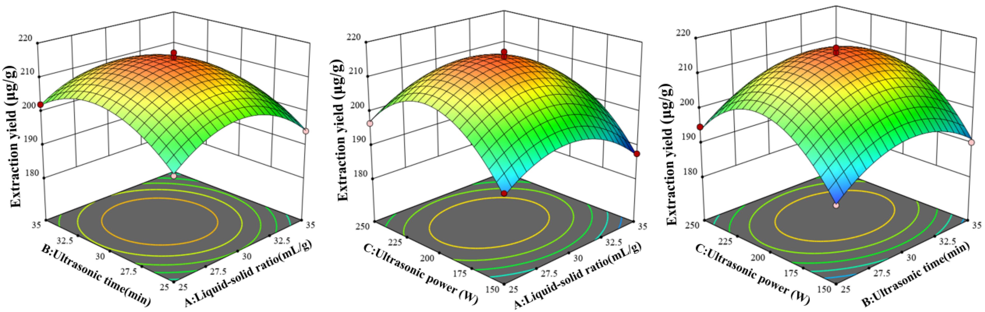 | X1 (mL/g) | X2 (min) | X3 (W) | ||