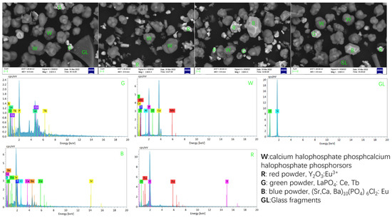 According to EDS analysis (Figure 1), the phosphor waste is primarily composed of fine phosphor particles—including calcium halophosphate phosphors along with red, green, and blue phosphor powders—as well as glass debris.