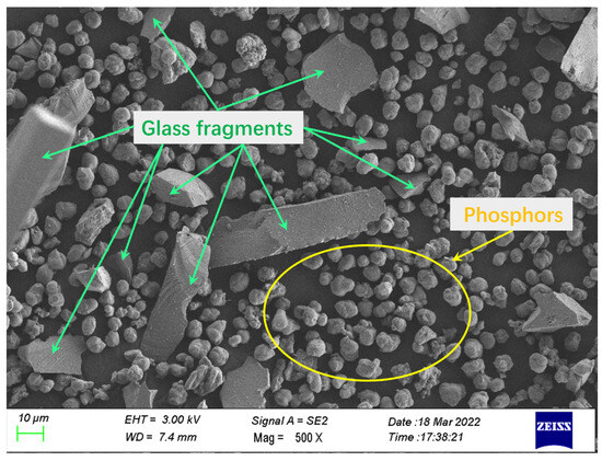 Overall, as illustrated in Figure 2, the waste phosphor samples exhibit variations in both particle size and morphology. Based on EDS analysis results (Table 1 and Table 2, Figure 1), the larger particles (>20 μm), which display irregular shapes with smooth surfaces and sharp edges, were identified as glass fragments. In contrast, the smaller particles (<20 μm) consisted of phosphor particles and fine glass fragments. The phosphor particles were characterized by a smooth surface and relatively regular, dense spherical morphology, with a typical particle size of approximately 10 μm.