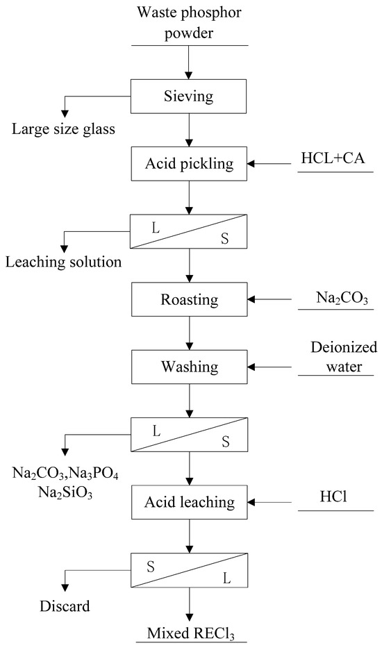 The rare earth element (REE) recycling process from waste phosphor powder employed in this study is illustrated in Figure 3. The procedure consists of five main stages: