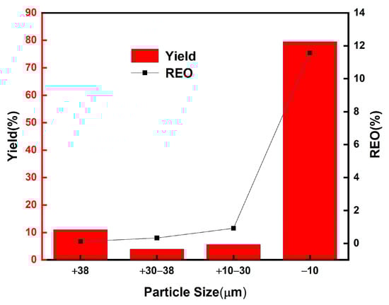 By employing a 30 μm sieve to remove large-sized glass debris, analysis of the <30 μm fraction revealed an increase in REO content from 9.3% to 10.9%, accompanied by a minimal rare earth loss of only 0.3%. Concurrently, the SiO2 content decreased from 8.8% to 7.2%, corresponding to a removal efficiency of 18.0%. These results demonstrate that sieving effectively separates phosphor particles from glass fragments in the waste material, with negligible loss of rare earth elements, rendering the process highly efficient for Pre-enrichment purposes.