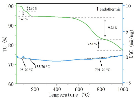 The alkaline roasting process involving waste phosphor and sodium carbonate was investigated using differential thermogravimetric analysis (TG-DSC). The pre-enriched phosphor was thoroughly mixed with sodium carbonate at a mass ratio of 2:1. TG-DSC analysis of the mixture was conducted from room temperature to 1000 °C under an air atmosphere, with a heating rate of 10 °C·min−1. The resulting thermograms are presented in Figure 6.