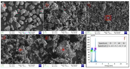 Based on the TG-DSC analysis results, the alkaline roasting conditions were ultimately optimized to 700 °C for 1 h. A comparison of the microstructural images before (Figure 7a) and after (Figure 7b) alkaline roasting reveals distinct morphological changes: the original waste rare earth phosphors exhibit irregular spherical shapes with relatively smooth surfaces, dense structures, and well-defined edges. In contrast, after high-temperature alkaline roasting, the phosphor particles show significant erosion, accompanied by notable alterations in morphology and particle size. The roasted products were decomposed into numerous fine flocculent particles, forming a loose and porous surface structure. Furthermore, some alkali-roasted particles exhibit a dense core surrounded by a cloud-like, loose flocculent outer layer, as illustrated in Figure 7c–e. EDS analysis (Figure 7f) indicates that these particles primarily consist of silicon and oxygen, suggesting that they represent residual glass fragments that were not fully decomposed by sodium carbonate during the roasting process.