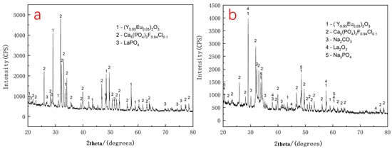 (a) XRD pattern of waste phosphor before alkali roasting; (b) XRD pattern of waste phosphor alkali roasting products.